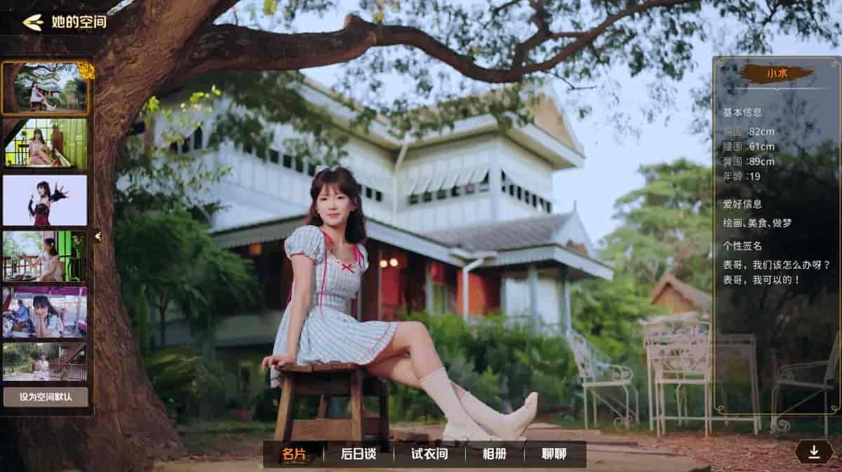 游戏提供了提供了多达200个动态壁纸、换装视频及互动视频,拥有相当精致的女主个人页面,内容量庞大。如在女主角“小水”的页面中,系统便提供了名片,多达15种换装风格的动态试衣间,伴随玩家一路出现在剧情中高光时刻的的写真相册,更有集成了AI聊天功能的“聊聊”板块,让玩家在游戏之外,还能自由体验与女主们的文字亲密互动,体验感拉满。